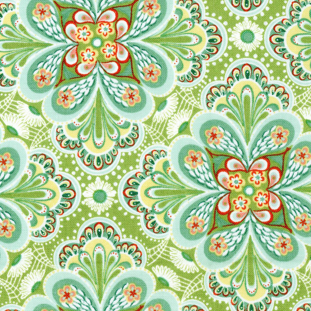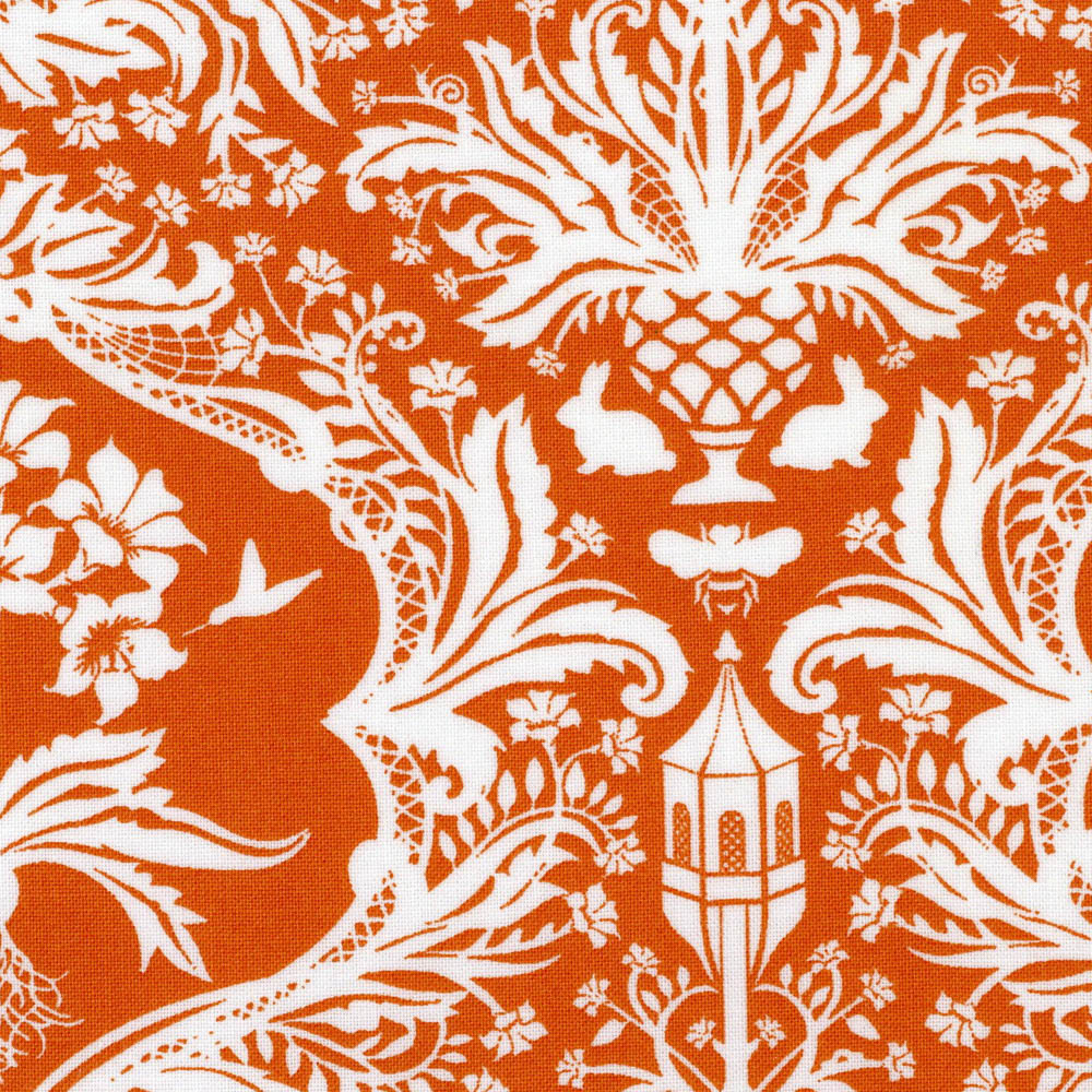 - garden damask with a framed flower arrangement and alternating bird feeder graphics with bunnies, caterpillars, spider webs, and other little critters hidden throughout